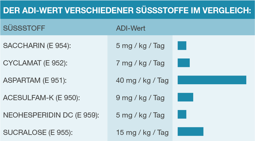 Der ADI-Wert gibt die Menge eines Stoffes an, die über die gesamte Lebenszeit täglich zu sich genommen werden kann, ohne dass dadurch gesundheitliche Gefahren entstehen. Er wird in Milligramm pro Kilogramm Körpergewicht pro Tag angeführt. Bei Aspartam beträgt dieser Wert 40 mg/kg/Tag. Umgerechnet auf ein durchschnittliches Körpergewicht von 70 kg beträgt die zulässige Menge also 2,8 g Aspartam – was der Süßkraft von 560 g Zucker entspricht. Die Abkürzung ADI kommt vom englischen „acceptible daily intake“ und wird im deutschen mit erlaubte Tagesdosis (ETD) übersetzt.